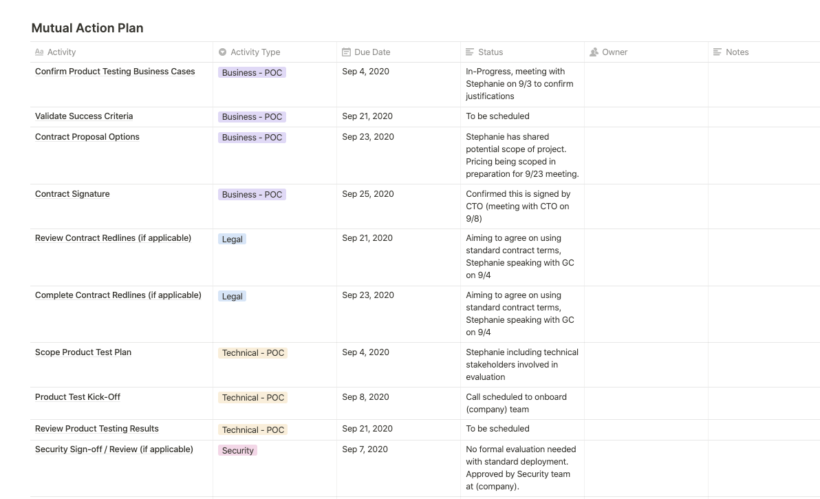 A Mutual Action Plan (MAP) is a brief document that helps your team and prospective customer build a mutually agreed upon plan to execute on an evaluation in partnership rather than a passive transaction. Using a MAP establishes a level of accountability and visibility of the evaluation and buying process between you and the prospective customer. This can feel like an unnatural process, but the customer’s willingness to participate in this exercise indicates their level of interest and willingness to secure a contract. It’s important to keep in mind that getting budget approval, team participation, and securing a contract may be a challenging feat for the person you are selling to. Building such a plan and partnership establishes a clear path and focus on the right sales cycles.