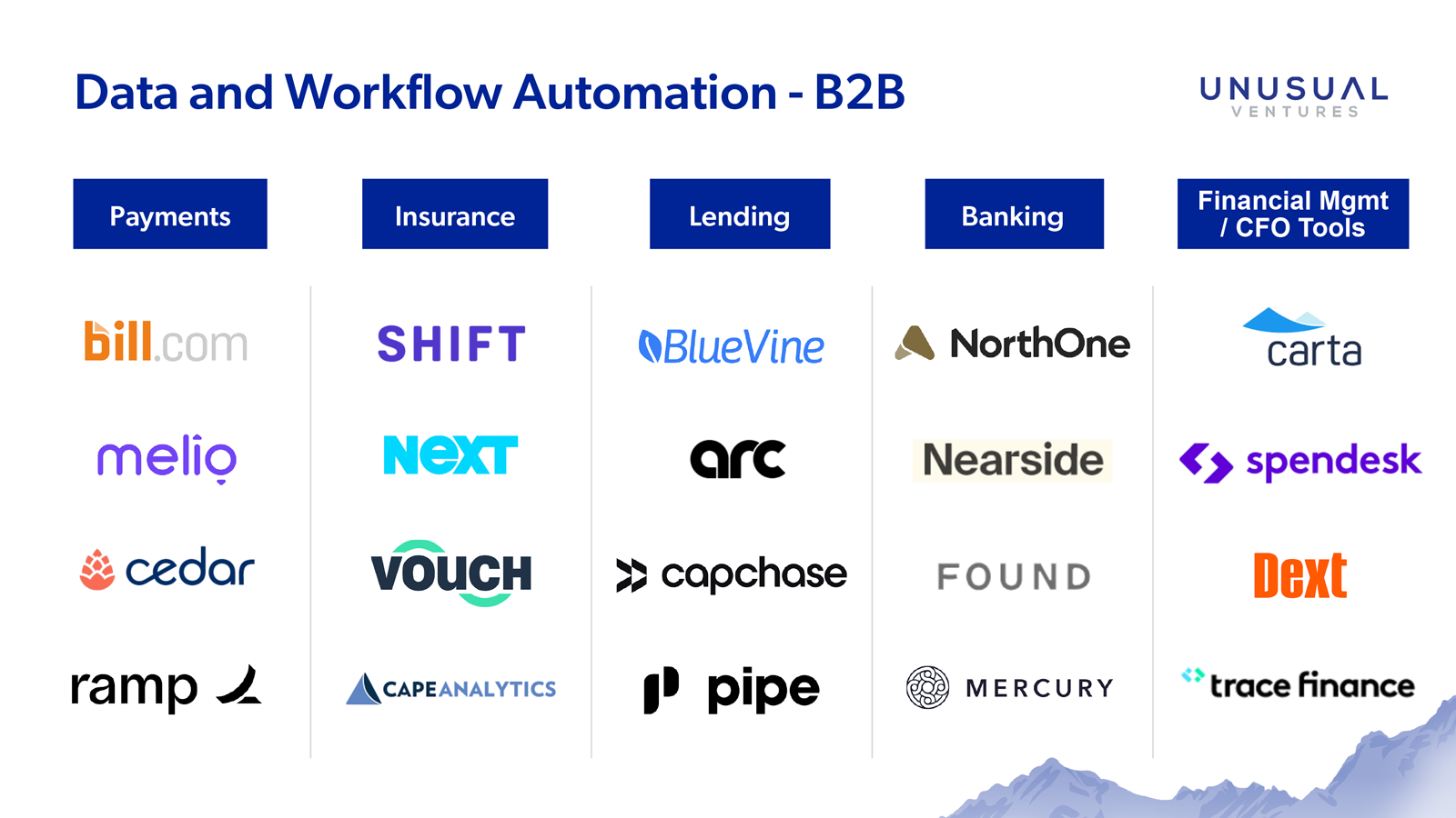 We typically define data and workflow automation tools as platforms that help financial and nonfinancial service institutions better transact, protect, and share their data with other business entities or improve their internal operations. This includes increased automation of internal financial services practices to streamline many of their operations and reduce manual headcount. B2B also includes more data analysis and underwriting to better assess risk when partnering with other financial entities and/or consumers. More recently, startups that provide upfront capital without dilution to SaaS startups have gained significant investor interest including Pipe and Arc along with startups that provide financial management platforms and tools for CFOs such as Carta and Dext.