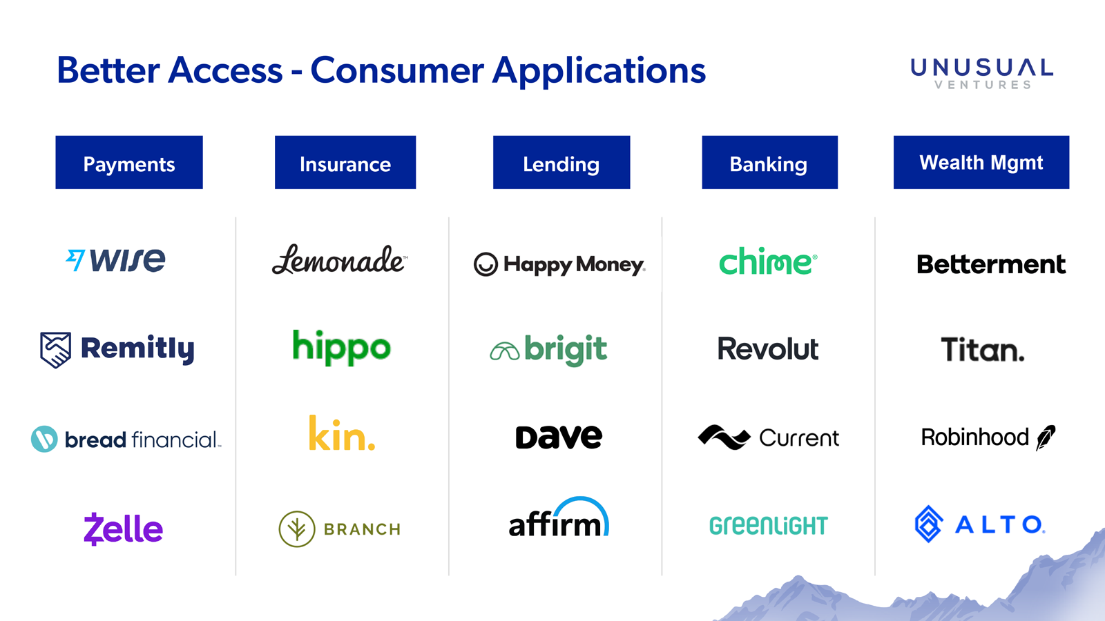 This category includes better ways for consumers to bank, borrow, spend, and protect their assets. Some of the areas that have seen innovation include more financial access (often driven by better data on consumer risk) and the portability of account information across a consumers’ financial life.