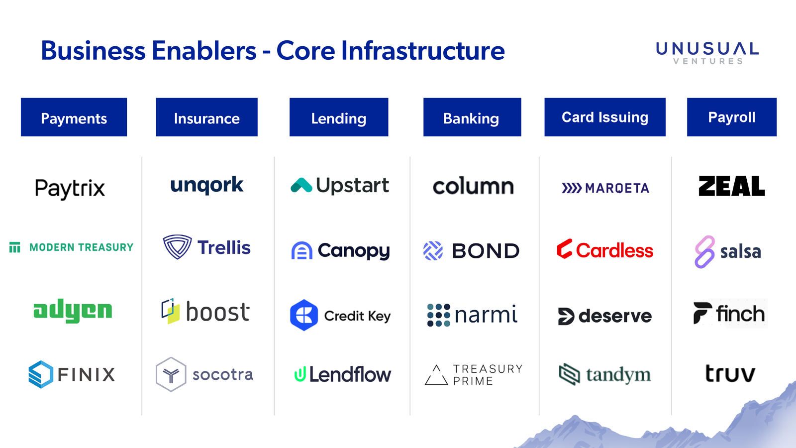 Core infrastructure includes cloud-native platforms that power the decision-making and management of users on these fintech applications. Infrastructure offerings have also evolved to include custom label solutions where startups that don’t want to go through the necessary regulatory approvals to become an issuing bank, but still want to offer financial products. These “as-a-Service” solutions including credit-as-a-service and banking-as-a-service allow startups to build financial products much more quickly and embed them into their finance flow. Many financial solutions are embedded on a company’s platform and can also build greater customer loyalty and increase LTV/spend. A great example is Starbucks and their massively successful loyalty application, which creates a closed-loop payments ecosystem.