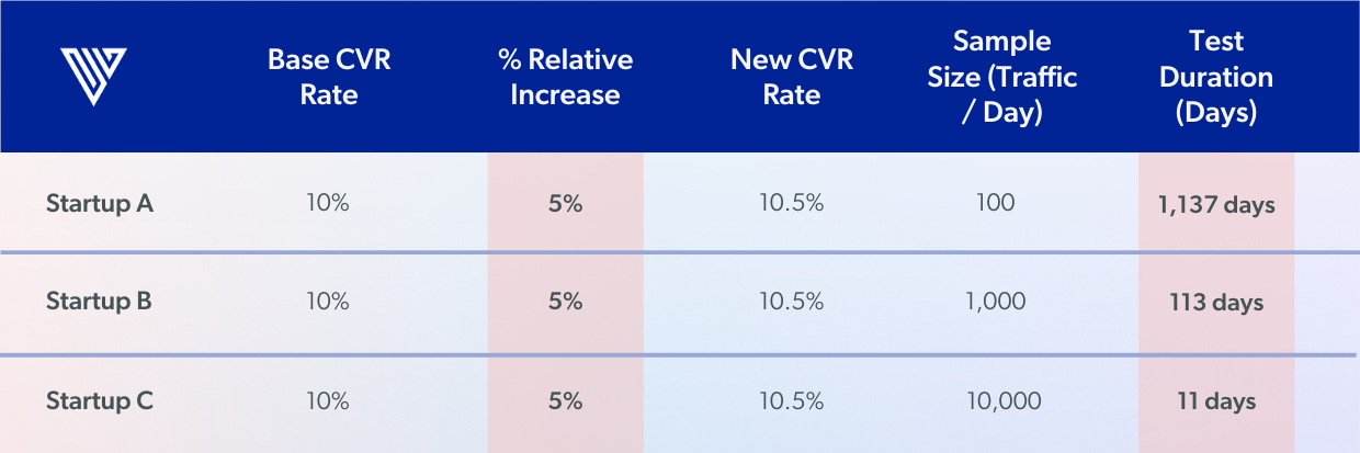 Here’s how to interpret it: Companies with a large sample size (a lot of traffic) don’t have to be as thoughtful with experiment selection and design. The reason is that the large company can make relatively small changes to the product, set up an A/B test to measure the effect, and then resolve the experiment in a matter of days at high statistical confidence because they have a wealth of data to lean on. On the other hand, a small startup with very little traffic (small sample size) needs to be much more thoughtful about experiment selection and design because an A/B test on a small sample size that produces a small change relative to the control will take weeks or months to harvest enough data to reach a statistically significant conclusion. I’ll demonstrate this effect in the below table.
