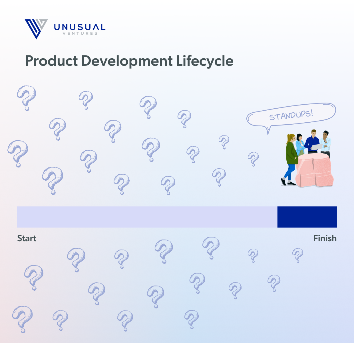 In any case prior to a launch, standups are mostly a waste of time. That’s because the bulk of the product development process centers around (1) building (2) making decisions. Point #1 is obvious (of course the team is busy creating stuff), but point #2 deserves a discussion, since that’s the meat and potatoes of the subject.