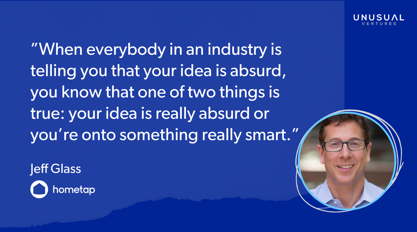 The insight for Hometap came from a conversation with Jeff’s colleague — now a co-founder — about how home ownership is unattainable for many. Jeff had also heard about someone who had sold his home to free up capital to pay for his mother-in-law’s healthcare. This led him to think about how homeowners need more equity alternatives. The only alternative at the time for a homeowner was to borrow and borrow more.