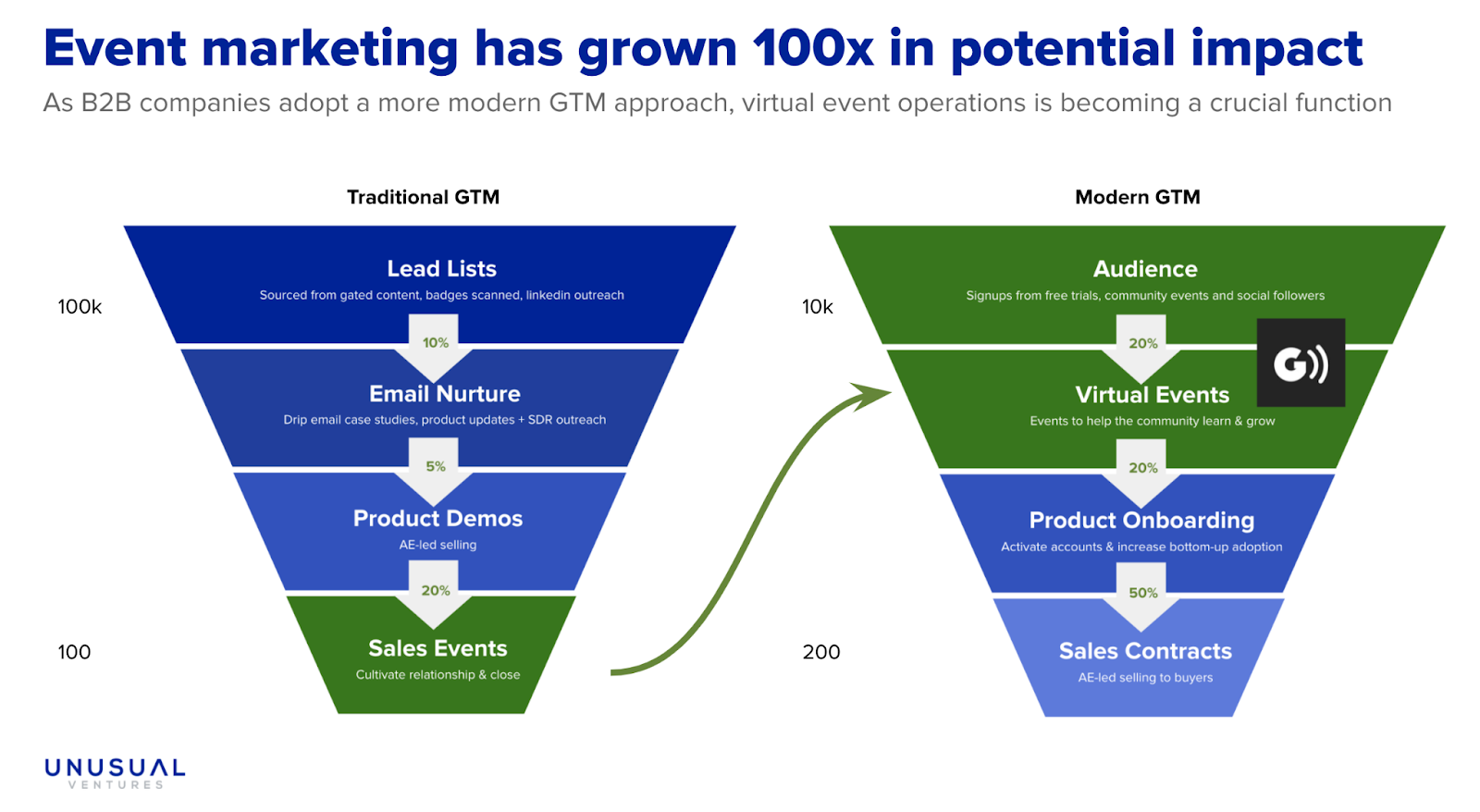 Modern GTM was on the rise. More software companies were investing in community, education, and product-led growth, changing the activities that mattered at the top of the funnel. With a push from the pandemic, virtual events have emerged as one of the best ways to engage and nurture a company’s audience — by helping them learn and grow together with their peers and community leaders.