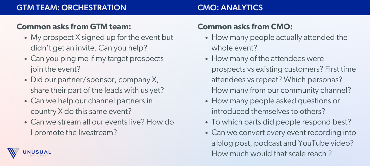 These challenges fall into two buckets: orchestration and analytics. If you have never worked on a marketing team, here’s a sample of questions that every B2B event marketer dreads because the answer is often “I don’t know” or “I need days to figure that out”.