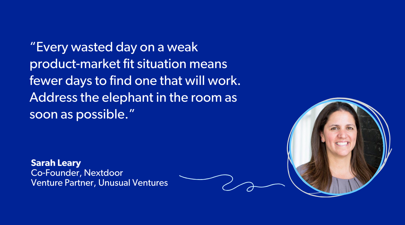 If you think your product-market fit is weak or non-existent, it’s valuable to address the issue as soon as possible. Many companies over the last few years raised capital ahead of their traction. This gives them time to try new approaches and maybe to pivot. But you need to move decisively. Every wasted day on a weak product-market fit situation means fewer days to find one that will work. Address the elephant in the room as soon as possible.
