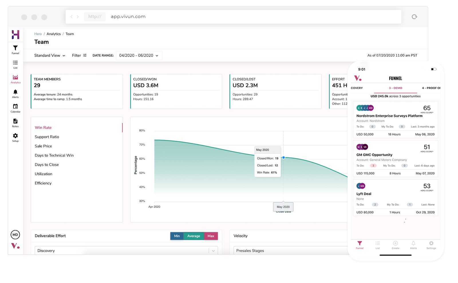 Vivun, the creator of the first software platform specifically designed for presales teams, Hero by Vivun, transforms the way B2B companies go to market. Hero leverages the strategic potential of presales, which consists of sales engineers, solution architects, or Field CTOs— i.e. the people at a company with technical backgrounds who understand the product from the functional level and can explain the details to both the user and buyer. In addition to providing sophisticated tools for Presales management, Hero keeps product and sales teams aligned, identifies in-demand product features and automatically alerts salespeople when new product releases could bring opportunities back to life.