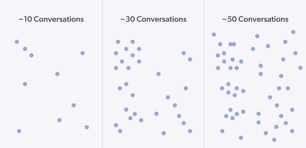 The way I think of it is that you’re collecting unstructured data every time you have a conversation with a customer. It’s not structured like the data you retrieve from a database. Rather, you’re looking for structure (i.e. patterns) in the data that only becomes apparent once you’ve had enough customer conversations. For example, imagine that an insight from a customer conversation is a data point that you plotted on some nebulous graph, like I’ve shown below. Each time you have a conversation you collect insights and start plotting them into groups based on similarities/themes. Once you’ve had enough conversations, the themes start to cluster around common insights or customer needs.