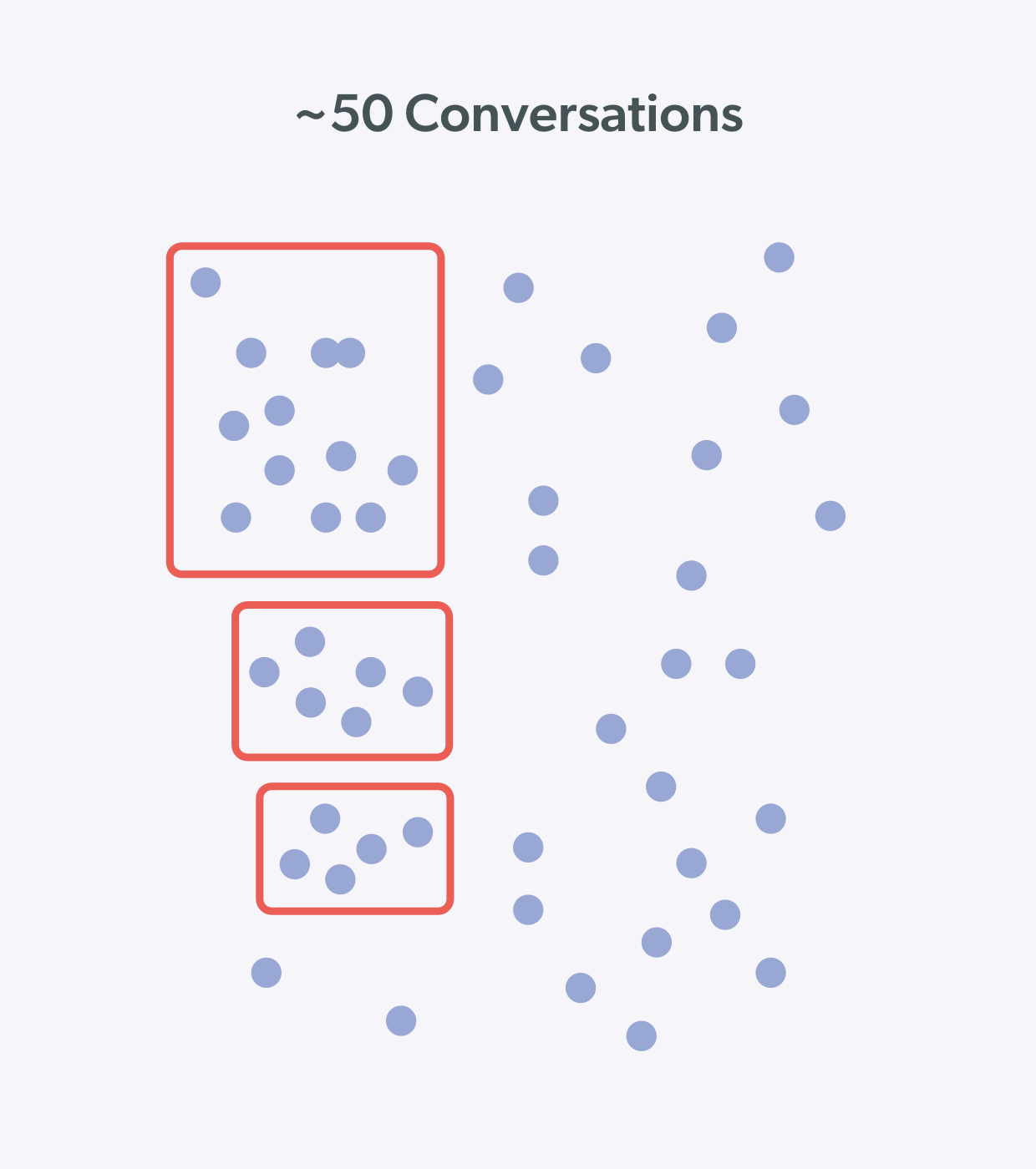 Once you hone in on the clusters they start to make sense to you and “feel” obvious, especially after you’ve had enough conversations with a customer. In the below example, each cluster outlined in red could lead to a meaningful product decision.