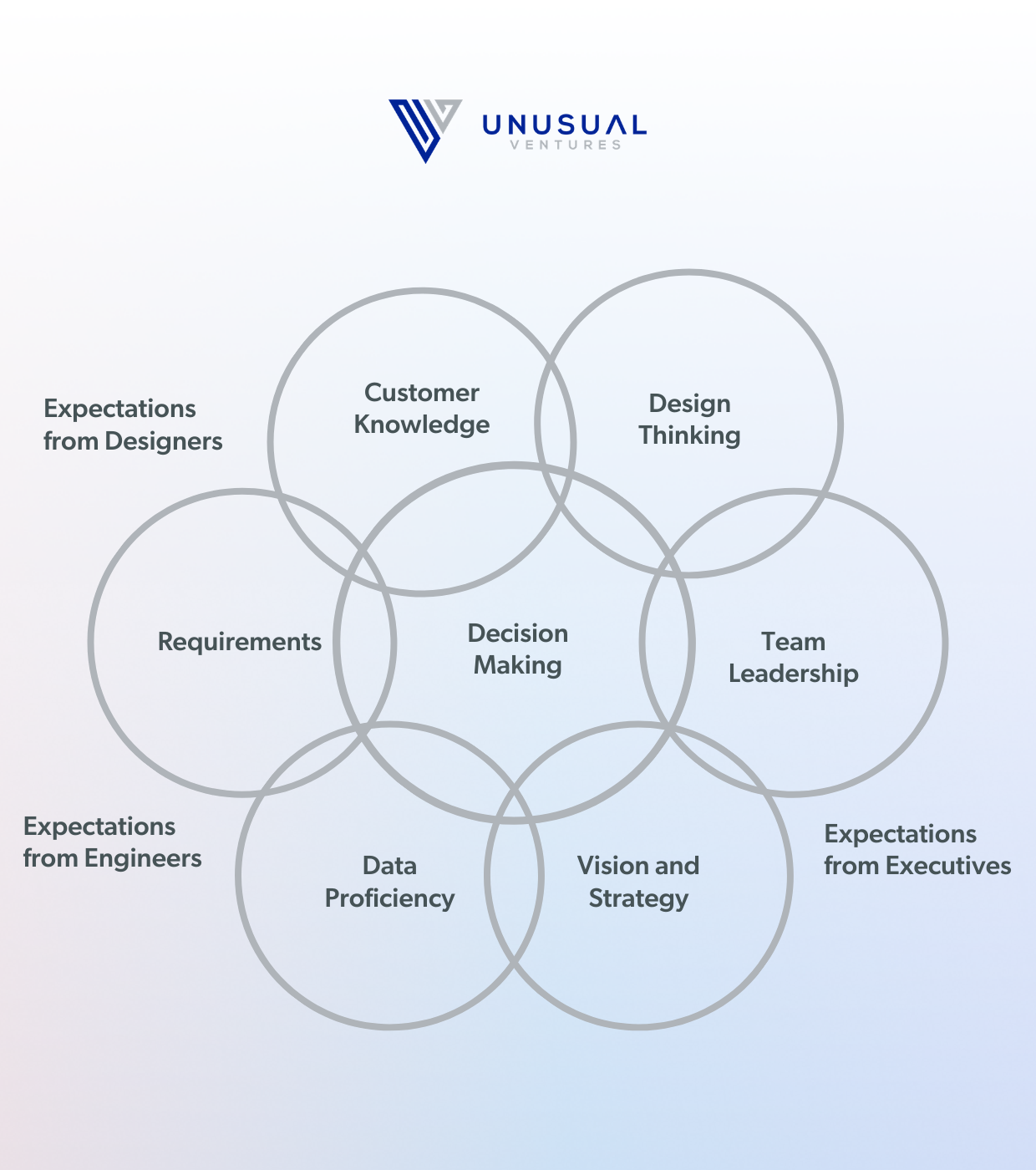 As you can see, the requirements for becoming an exceptional product manager are high and numerous. Going back to the original venn diagram analogy, exceptional product managers need to have a lot of overlapping skills and each function within the company places particular emphasis on some of those skills. Engineers might assess a PM based on data proficiency and quality of requirements, design might assess based on customer-centricity and some degree of design thinking, while executives may assess a PM based on the ability to lead a product team through complex initiatives and fidelity of vision and strategy. Across the board, everyone is expecting a PM to be a good decision maker.